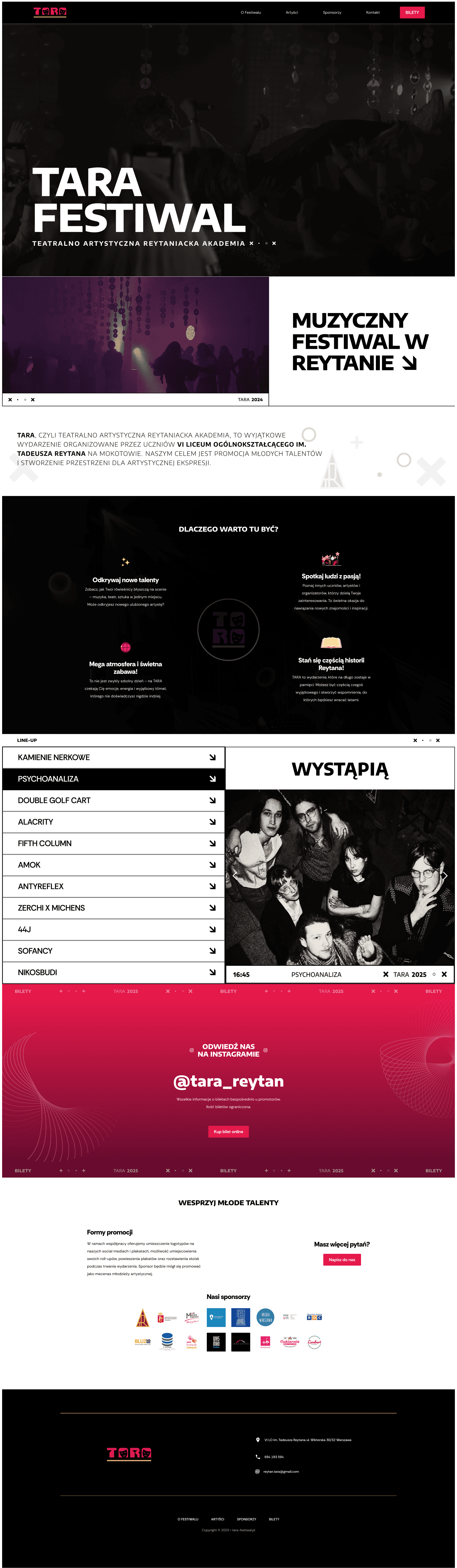 TARA – Teatralno Artystyczna Reytaniacka Akademia – is an art festival organized by students of the 6th Tadeusz Reytan High School in Warsaw. It promotes young artists and builds a community around music, theater, and visual arts. The client needed a modern, engaging one-page website that appeals to high school students and maintains a professional tone for sponsors.